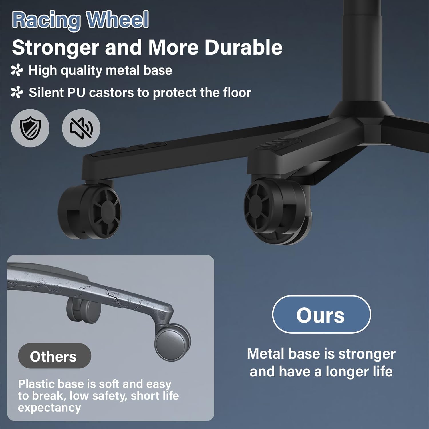 Built on a heavy-duty foundation, the chair includes a metal base, smooth-rolling castor wheels, and high-density foam for long-lasting seating comfort. Ideal for gamers, streamers, professionals, and anyone who wants a premium chair with exceptional comfort.