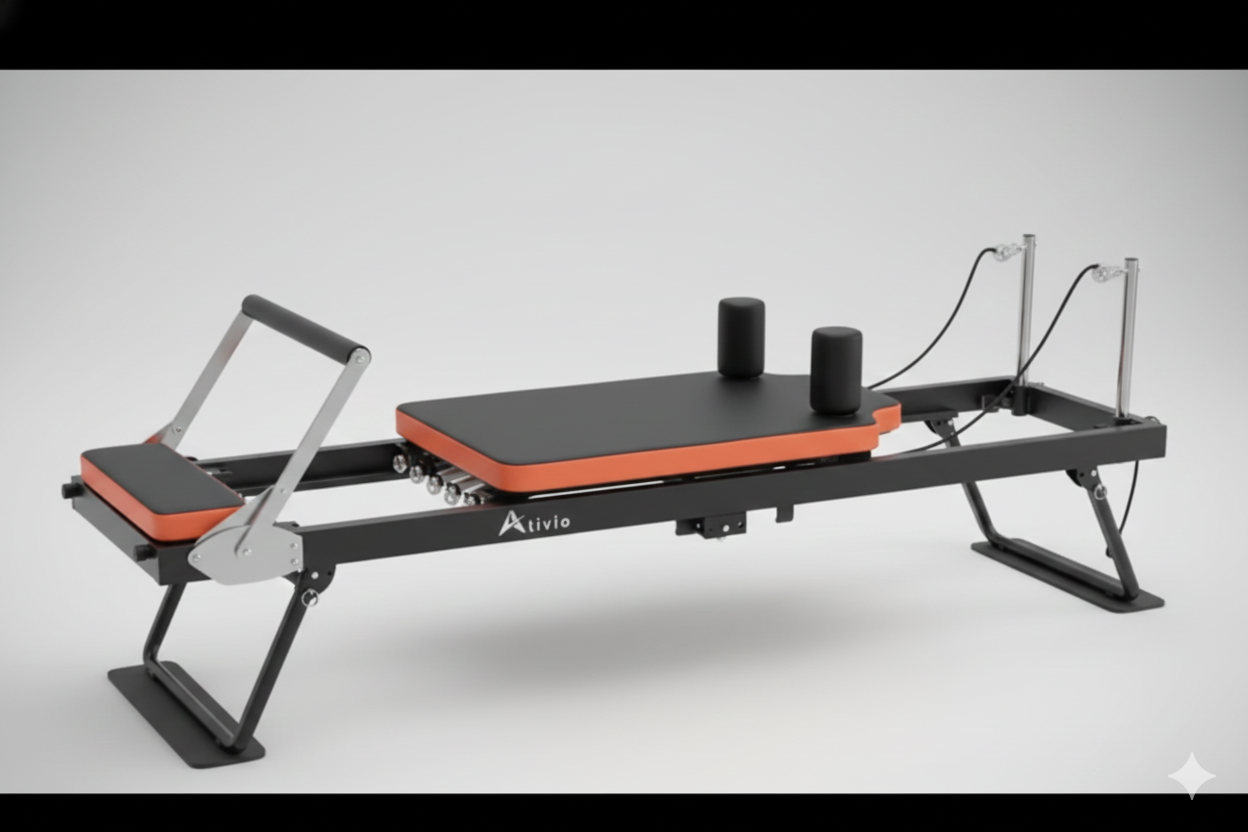 Alivio Professional Pilates Reformer Machine – Home & Studio Fitness Station with Adjustable Resistance Springs, Padded Carriage, and Heavy-Duty Frame (Black/Orange)
