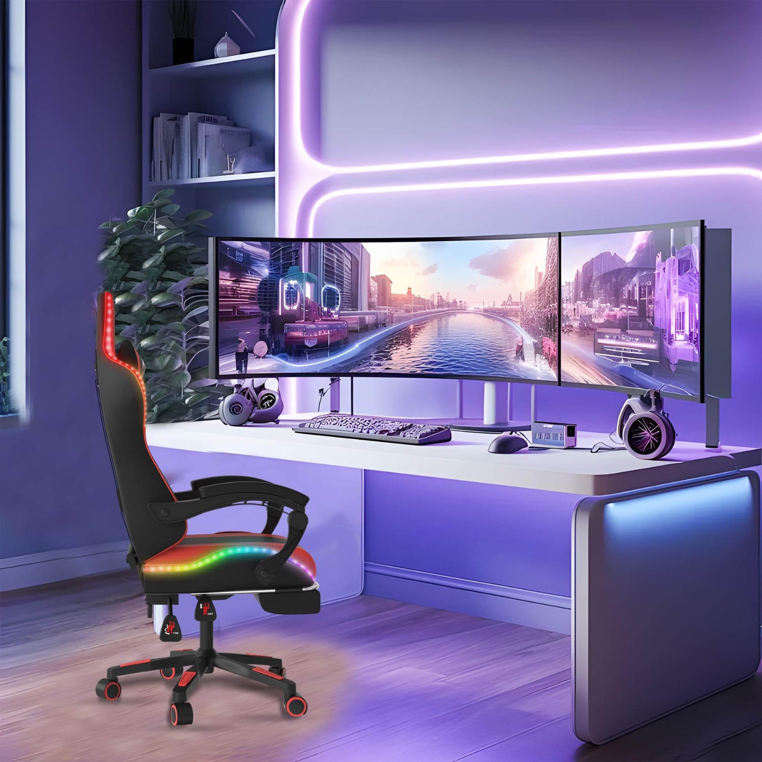 Alivio Wireless App Control LED Gaming Chair with Massage Lumbar Cushion & Retractable Footrest, 360° Recline & Swivel Breathable Leather Office Massage Chair, PU Leather Video Game Chair (Red)
