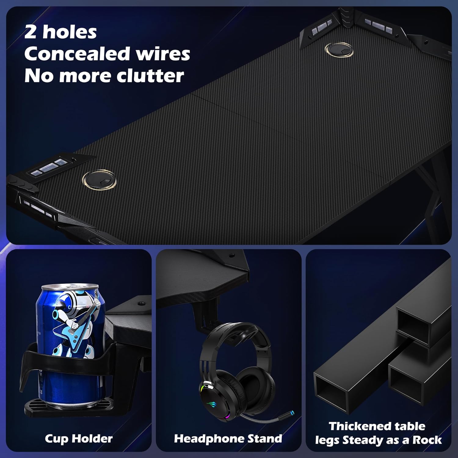The Alivio LED Gaming Desk is designed to elevate your gaming setup with style, comfort, and performance. Measuring 120 x 60 x 74cm, it features a sleek ergonomic curved design with a premium 3D carbon fiber texture tabletop for a modern and durable finish. Its immersive RGB LED lighting offers dynamic colors, wireless control, and customizable brightness, speed, and mode settings to create a personalized gaming atmosphere. Built with a sturdy 0.8mm steel frame coated in protective plastic and an E1-grade 1.5cm thick particle board, it ensures rock-solid stability and long-lasting strength. The desk includes dual cable management holes to keep wires neatly organized, a cup holder and headphone stand for added convenience, and adjustable feet for perfect balance on any surface. A large mouse pad is also included, providing smooth, precise control for all your gaming needs. Combining functionality with futuristic aesthetics, the Alivio LED Gaming Desk delivers a truly immersive and clutter-free gaming experience.